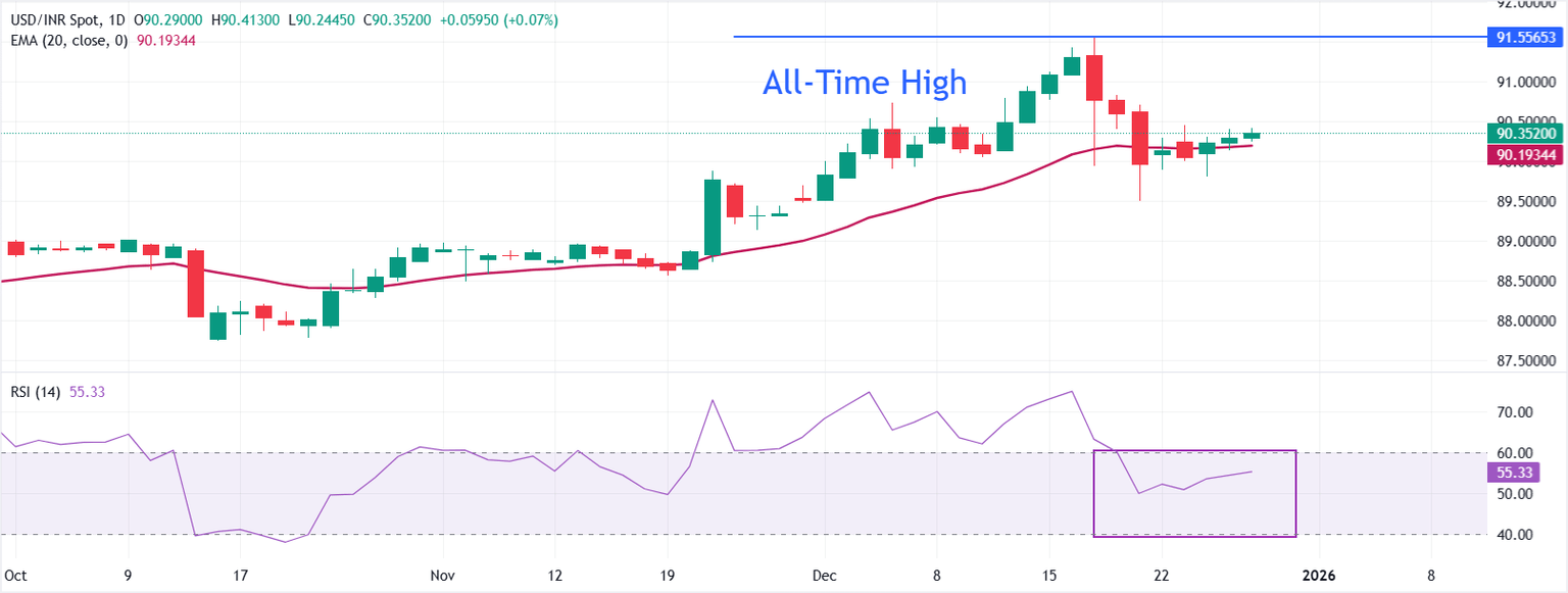 En el gráfico diario, el USD/INR cotiza a 90.3515. El par se mantiene por encima de una media móvil exponencial (EMA) de 20 días en 90.1934, manteniendo intacta una tendencia alcista a corto plazo. La pendiente de la media se mantiene positiva, reflejando una presión ascendente persistente.