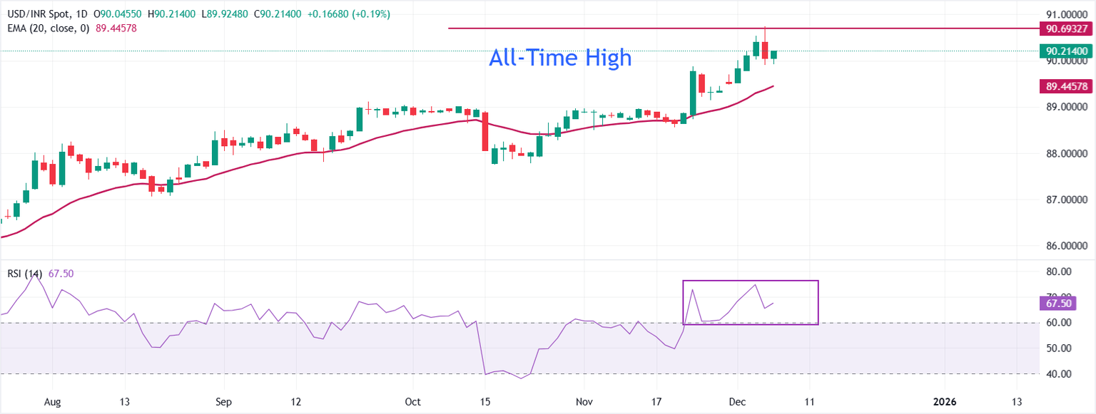 El USD/INR sube a cerca de 90.20 durante la sesión de apertura del viernes. El par corrigió el jueves después de alcanzar un nuevo máximo histórico alrededor de 90.70.