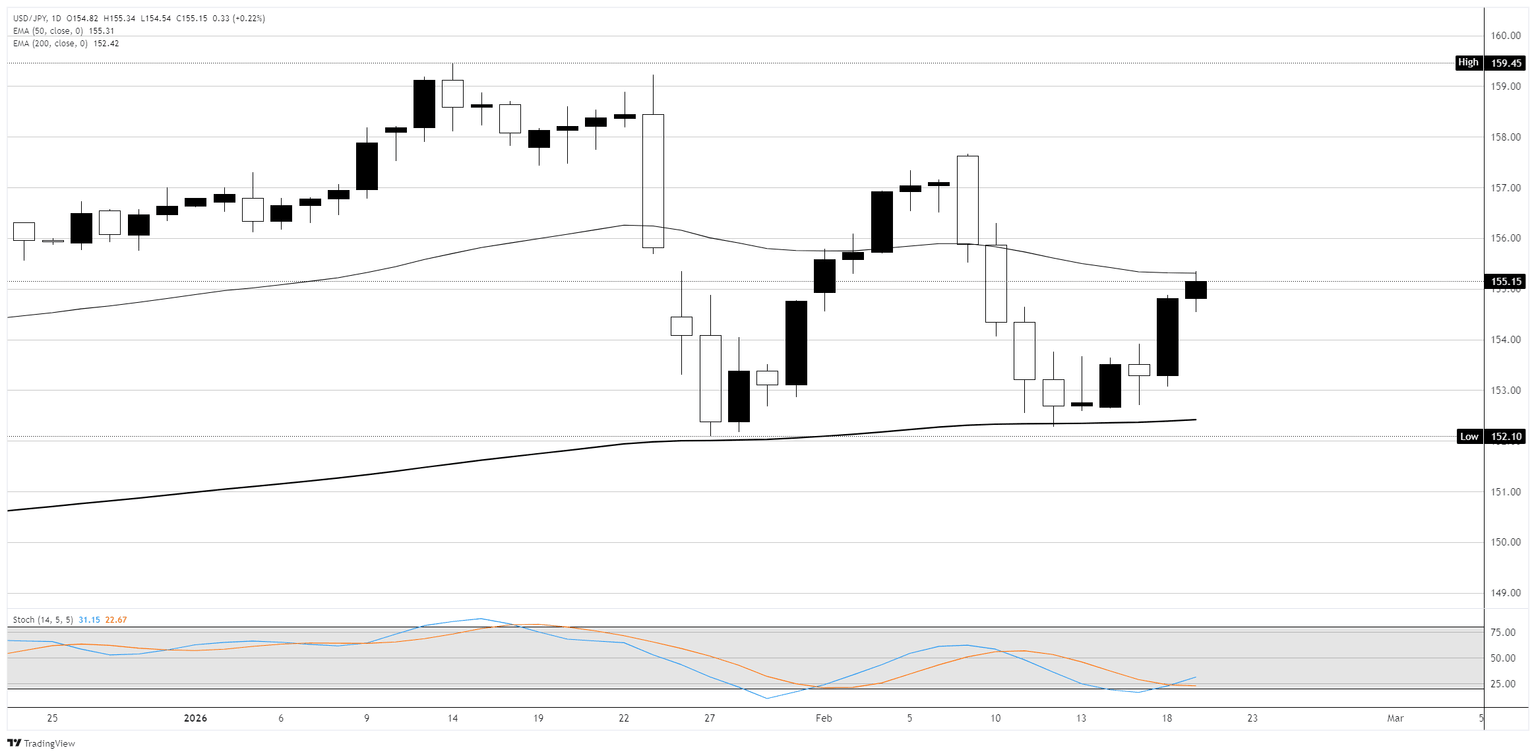 En el gráfico diario, el USD/JPY se mantuvo cerca de 155.00 el jueves, situándose justo por debajo de la media móvil exponencial (EMA) de 50 días a 155.30 después de rebotar desde el mínimo del año hasta la fecha de 152.10 registrado a principios de este mes. La EMA de 200 días en 152.42 sigue tendiendo bien por debajo, por lo que la estructura alcista a largo plazo desde los mínimos de finales de 2025 sigue siendo válida, pero el par ha estado cotizando en un rango irregular de 152.00 a 158.00 desde mediados de enero. La fuerte venta masiva desde el máximo de 159.45 hasta el mínimo de 152.10 retrocedió la mayor parte del repunte de enero, y el par ahora está disputando la EMA de 50 días como un nivel pivote. El oscilador estocástico se está acercando a la zona de sobreventa después de cruzar a la baja, sugiriendo presión a la baja a corto plazo, aunque un rebote desde esta área sería consistente con el patrón de negociación en rango más amplio. Las sesiones recientes muestran velas alcistas y bajistas alternas con cuerpos en expansión, apuntando a una volatilidad bidireccional alrededor del nivel de 155.00. La resistencia se sitúa en 156.00 y en el área de 158.00; una ruptura sostenida por encima de la EMA de 50 días apuntaría al extremo superior del rango. El soporte se encuentra en 153.00 y en la EMA de 200 días cerca de 152.42, con el mínimo de 152.10 por debajo.