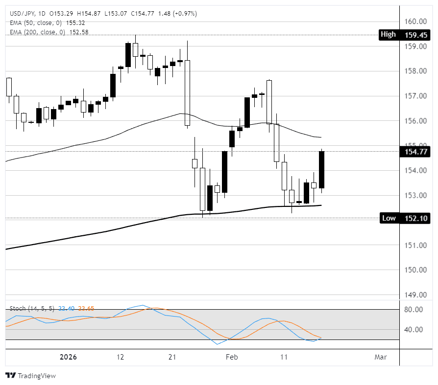 En el gráfico diario, el USD/JPY abrió el miércoles cerca del nivel de 153.00 antes de subir alrededor de un 1%. El rebote produjo una sólida vela alcista, pero el precio se ha estancado justo por debajo de la EMA de 50 días en 155.30, que actúa como resistencia inmediata. La EMA de 200 días se sitúa más abajo cerca de 152.60, y el precio se está negociando entre los dos promedios, sugiriendo que el par está en una fase de transición tras la fuerte venta masiva desde el máximo de enero cerca de 159.45. El oscilador estocástico está girando al alza desde la zona de sobreventa, sugiriendo que el impulso a la baja se está desvaneciendo, y podría desarrollarse un repunte de alivio a corto plazo. Una ruptura por encima de la EMA de 50 días en 155.30 tendría como objetivo 156.00 y el área de consolidación de mediados de enero. No lograr despejarlo dejaría al par vulnerable a una nueva prueba del soporte en 153.00 y el mínimo del año hasta la fecha en 152.10.