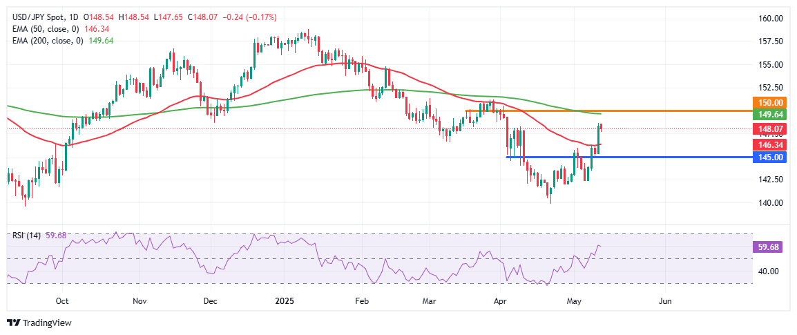 Técnicamente, el par rompió decisivamente por encima de la media móvil exponencial (EMA) de 50 días el lunes, pero enfrentó un rechazo intradía el martes en el máximo del día anterior de 148.65. Un movimiento sostenido por encima de esta resistencia podría abrir la puerta a un rally hacia la marca psicológica de 150.00, que se alinea con la EMA de 200 en 149.64 y los máximos de abril.