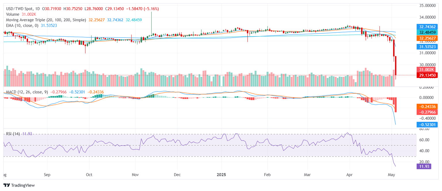 El USD/TWD se desplomó en la zona de 28.90 el lunes, profundizando su colapso histórico tras una caída del 5.7% que se sumó a la caída del 4.4% del viernes. El rally de dos días del Dólar taiwanés de más del 10% es el más agudo en más de tres décadas y ha desencadenado una especulación más amplia de que las economías asiáticas pueden estar permitiendo que sus monedas se aprecien para ganar ventaja en las negociaciones comerciales con EE.UU.