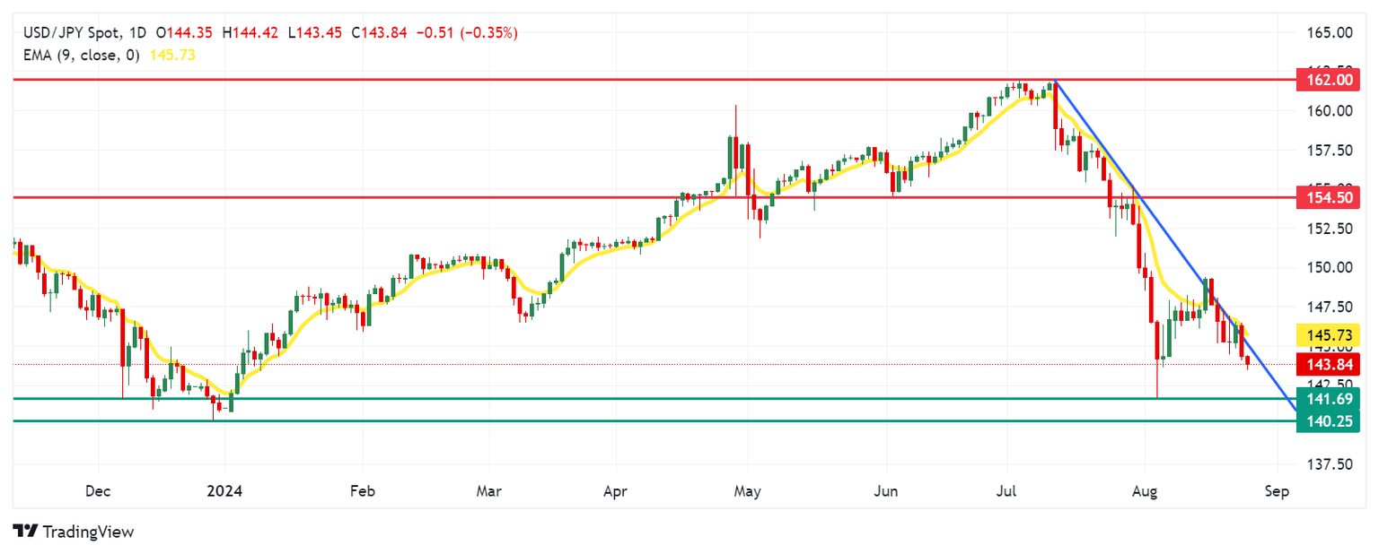 A la baja, el par USD/JPY podría navegar la región alrededor del mínimo de siete meses de 141.69, registrado el 5 de agosto. Una ruptura por debajo de este nivel podría llevar al par hacia el nivel de soporte de retroceso en 140.25.