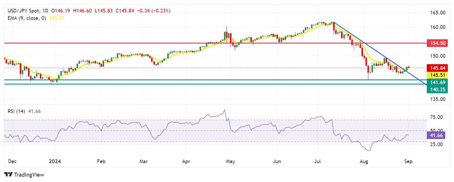 En términos de soporte, el par USD/JPY podría primero probar la media móvil exponencial (EMA) de nueve días en torno a 145.53, seguida por la línea de tendencia bajista cerca de 144.00. Si el par cae por debajo de este nivel, podría moverse hacia el mínimo de siete meses de 141.69, registrado el 5 de agosto, y posteriormente encontrar soporte alrededor de 140.25.
