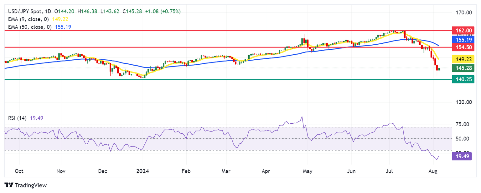 El USD/JPY cotiza alrededor de 145,20 el martes. El análisis del gráfico diario muestra que el par ha detenido su racha de pérdidas que comenzó el 30 de julio. El Índice de Fuerza Relativa (RSI) de 14 días está por debajo de 30, lo que indica que el par de divisas está sobrevendido y podría experimentar un rebote a corto plazo.