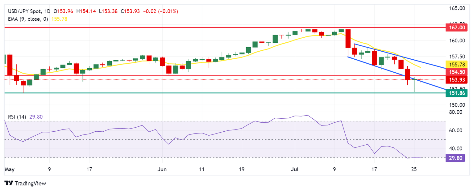 Al alza, el par USD/JPY podría probar el "nivel de soporte de retroceso convertido en resistencia" alrededor del nivel de 154.50. Una mayor resistencia aparece en la media móvil exponencial (EMA) de nueve días de 155.80, seguida por el límite superior del canal descendente alrededor de 156.60.