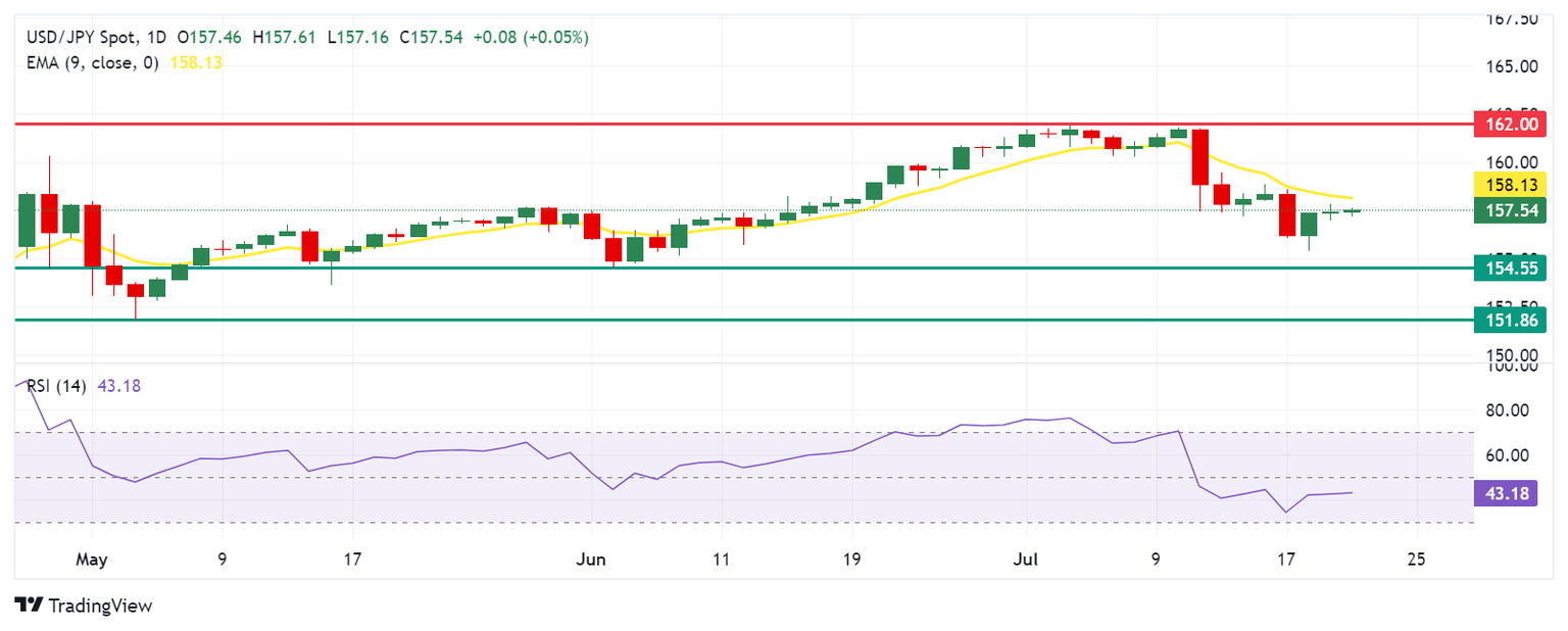 El USD/JPY cotiza alrededor de 157.60 el lunes. El análisis del gráfico diario muestra que el par está por debajo de su media móvil exponencial (EMA) de nueve días de 158.14, lo que indica un impulso bajista a corto plazo. Esto sugiere esperar señales de una reversión de tendencia antes de considerar una compra. Además, el Índice de Fuerza Relativa (RSI) de 14 días está por debajo de 50, lo que refuerza una perspectiva bajista.