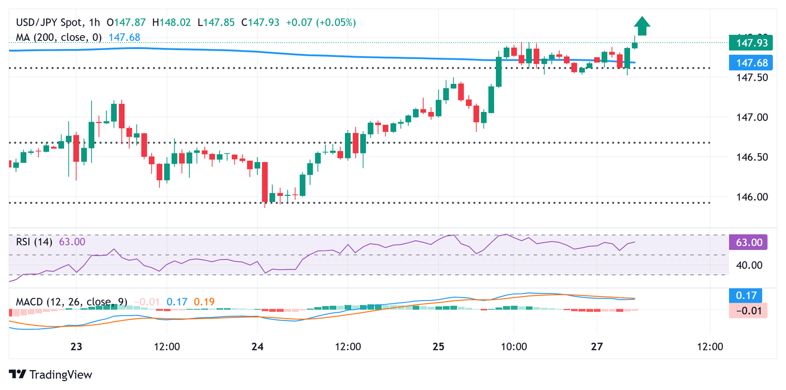 El USD/JPY sigue en camino de volver a probar el máximo de la semana pasada, alrededor de la región de 148.65