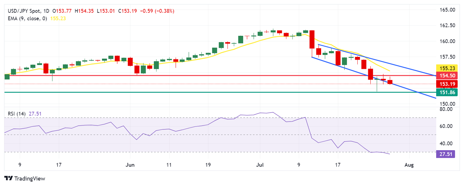 Al alza, el par USD/JPY podría probar la "resistencia convertida en soporte de retroceso" alrededor de 154.50. Es probable que haya más resistencia en la media móvil exponencial (EMA) de nueve días de 155.24, seguida por el límite superior del canal descendente cerca de 156.20.