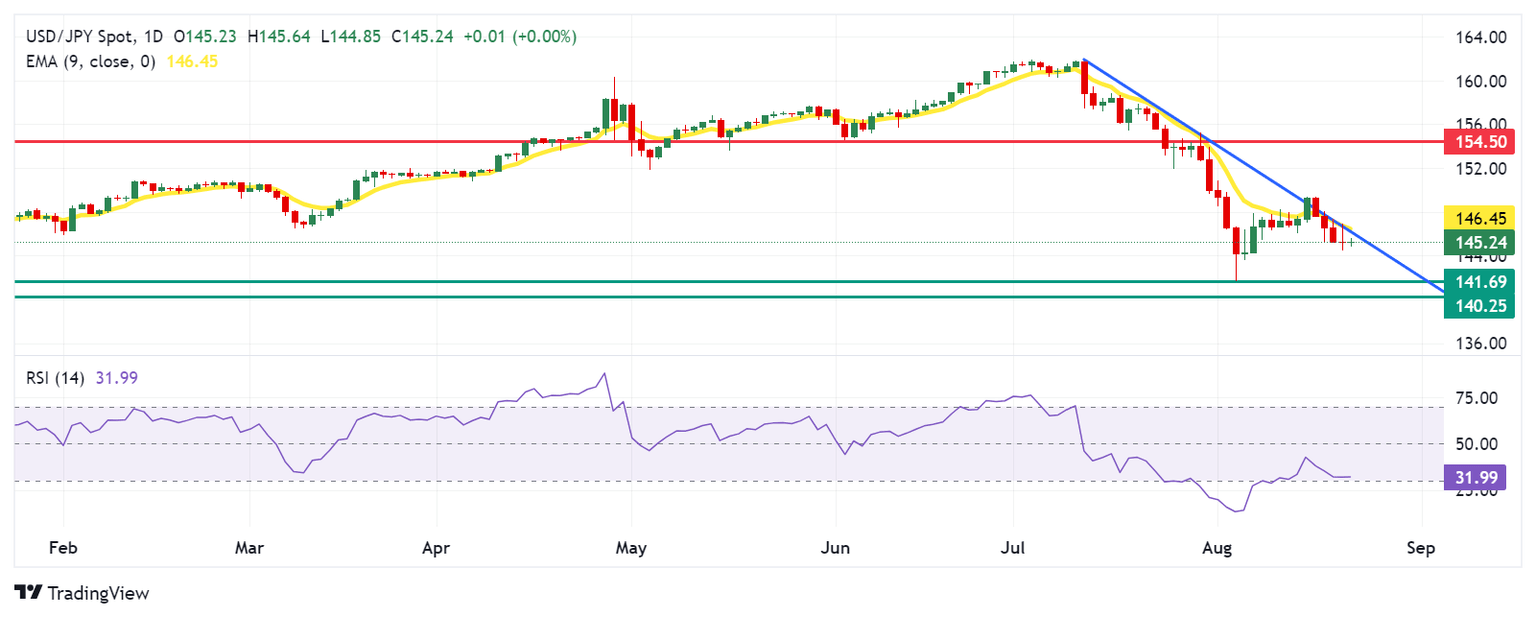 El USD/JPY cotiza alrededor de 145.20 el jueves. El análisis del gráfico diario muestra que el par se está consolidando bajo una línea de tendencia descendente, lo que sugiere un sesgo bajista. Además, el Índice de Fuerza Relativa (RSI) de 14 días está ligeramente por encima de 30, lo que sugiere una posible corrección para el par.