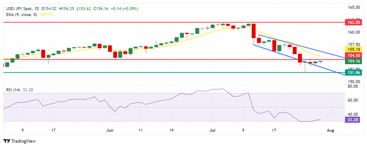 El USD/JPY cotiza alrededor de 154.00 el martes. El análisis del gráfico diario muestra que el par se está consolidando dentro de un canal descendente, lo que indica un sesgo bajista. Sin embargo, el Índice de Fuerza Relativa (RSI) de 14 días está ligeramente por encima de 30, lo que podría sugerir un posible rebote a corto plazo.