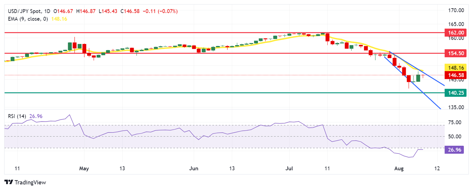 El USD/JPY cotiza alrededor de 146.50 el jueves. El análisis del gráfico diario muestra que el par se consolida dentro de un canal descendente, lo que sugiere una tendencia bajista. Además, el Índice de Fuerza Relativa (RSI) de 14 días se mantiene por debajo de 30, señalando un rebote a corto plazo.