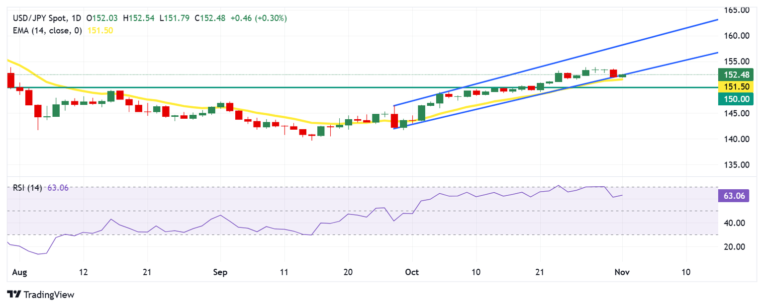 El par USD/JPY cotiza alrededor de 152.40 el viernes. El análisis del gráfico diario indica un posible debilitamiento del sesgo alcista, ya que el par ha roto por debajo de su canal ascendente. Sin embargo, el Índice de Fuerza Relativa (RSI) de 14 días se mantiene por encima de la marca de 50, lo que sugiere que el impulso alcista está activo.