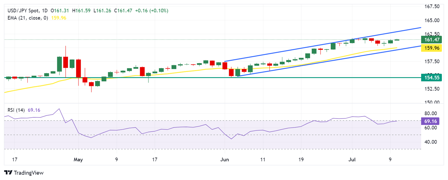 El USD/JPY cotiza alrededor de 161.50 el miércoles. El par mantiene su trayectoria ascendente dentro de un patrón de canal ascendente, lo que sugiere un sesgo alcista según el análisis del gráfico diario. Sumando a esta perspectiva alcista, el Índice de Fuerza Relativa (RSI) de 14 días se mantiene por encima del nivel 50, reforzando la fortaleza de la tendencia ascendente.