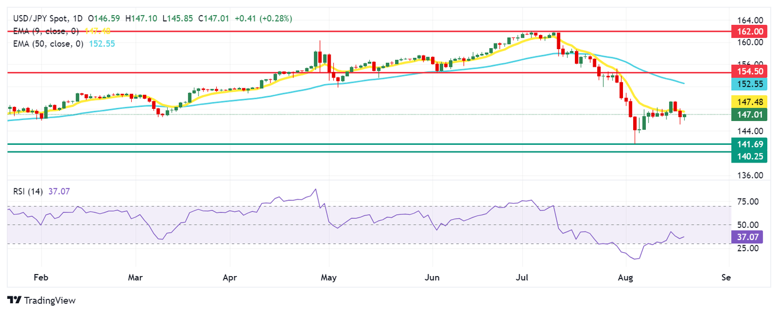 El USD/JPY cotiza alrededor de 146.60 el martes. El análisis del gráfico diario muestra que el par está justo por debajo de la media móvil exponencial (EMA) de nueve días, lo que indica una tendencia bajista a corto plazo. Además, el índice de fuerza relativa (RSI) de 14 días está ligeramente por encima de 30, lo que sugiere una posible corrección para el par.
