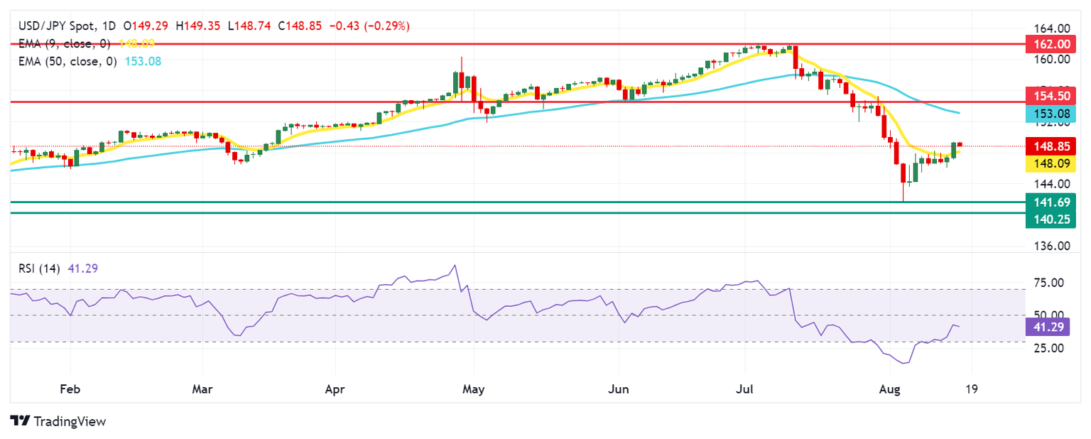 El USD/JPY cotiza alrededor de 148.80 el viernes. Según el análisis del gráfico diario, el par está por encima de la media móvil exponencial (EMA) de nueve días, señalando una tendencia alcista a corto plazo. Aún así, el Índice de Fuerza Relativa (RSI) de 14 días se mantiene por debajo de 50, y un aumento adicional confirmaría el impulso alcista.