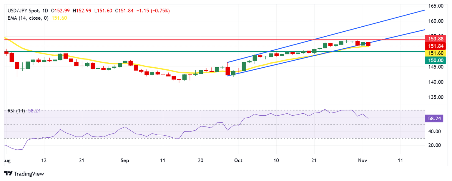A la baja, la media móvil exponencial (EMA) de 14 días en el nivel de 151.60 sirve como soporte inmediato para el par USD/JPY, con soporte adicional encontrado alrededor del nivel psicológico de 150.00.