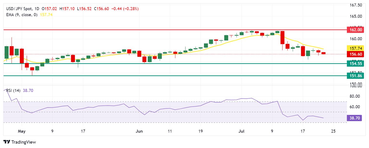 El USD/JPY cotiza alrededor de 156.60 el martes. El análisis del gráfico diario muestra que el par está por debajo de su media móvil exponencial (EMA) de nueve días de 157.75, lo que sugiere un impulso bajista a corto plazo. Además, el Índice de Fuerza Relativa (RSI) de 14 días está por debajo de 50, reforzando una perspectiva bajista.