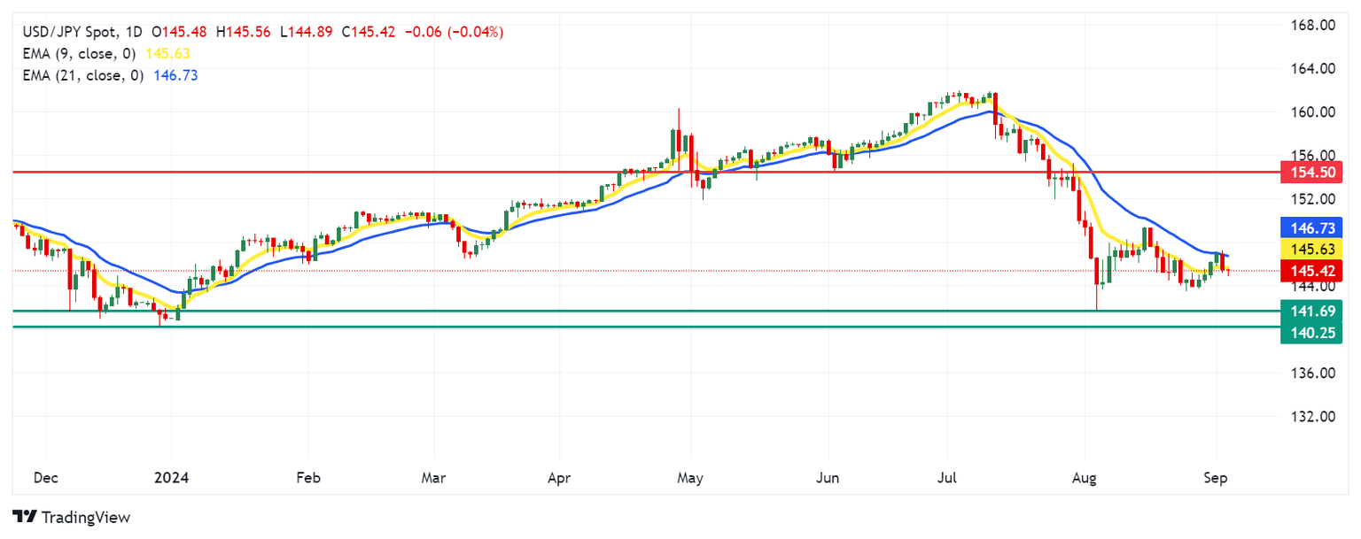 El USD/JPY cotiza alrededor de 145.40 el miércoles. Un análisis del gráfico diario muestra que la media móvil exponencial (EMA) de 9 días está por debajo de la EMA de 21 días, señalando una tendencia bajista en el mercado. Además, el Índice de Fuerza Relativa (RSI) de 14 días se mantiene por debajo de 50, confirmando aún más que la tendencia bajista sigue en vigor.
