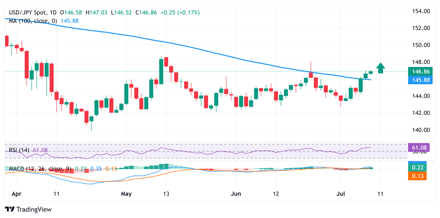 El cierre nocturno del par USD/JPY por encima de la media móvil simple (SMA) de 100 días por primera vez desde febrero podría verse como un nuevo desencadenante para los traders alcistas. Además, los osciladores en el gráfico diario han estado ganando tracción positiva y aún están lejos de estar en la zona de sobrecompra. La configuración técnica respalda la posibilidad de un movimiento de apreciación adicional a corto plazo hacia el obstáculo intermedio de 147.60-147.65 en ruta hacia la cifra redonda de 148.00, o el máximo mensual de junio.