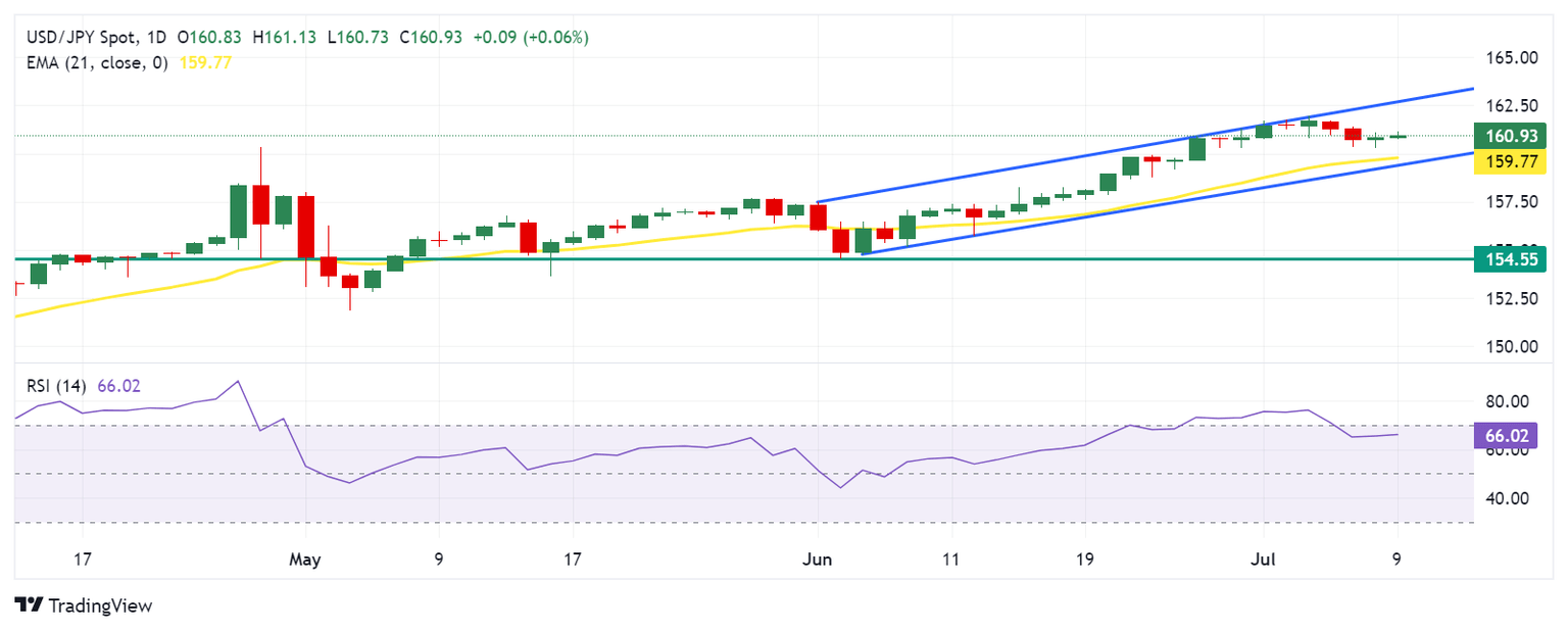 El USD/JPY cotiza alrededor de 161.00 el martes. El par permanece dentro de un patrón de canal ascendente, lo que indica una inclinación alcista basada en el análisis del gráfico diario. Además, el indicador de impulso, el Índice de Fuerza Relativa (RSI) de 14 días, se mantiene por encima del nivel 50, confirmando la tendencia alcista.