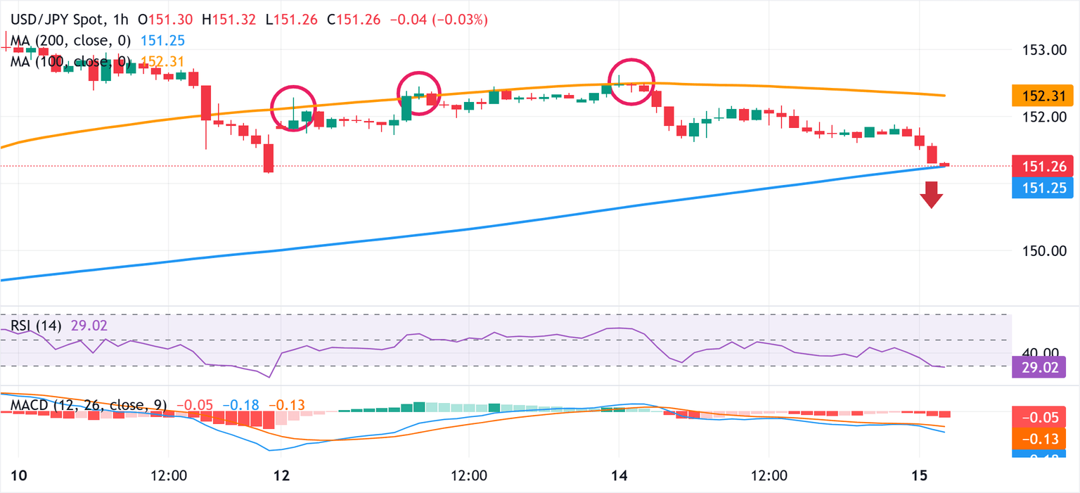 El USD/JPY podría acelerar la caída por debajo de la SMA de 200 horas, alrededor de 151.20-151.15
