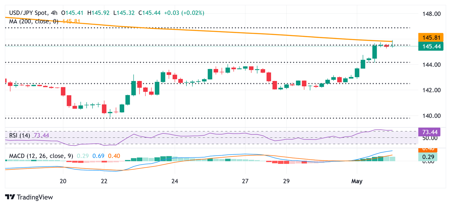 Desde una perspectiva técnica, la ruptura nocturna por encima del nivel de retroceso de Fibonacci del 38.2% de la caída de marzo-abril y la marca psicológica de 145.00 se vio como un desencadenante clave para los operadores alcistas. Además, los osciladores en el gráfico diario han comenzado a ganar tracción positiva y sugieren que el camino de menor resistencia para el par USD/JPY es al alza. Sin embargo, el movimiento posterior más allá del nivel del 50% de Fibonacci se detiene cerca de la media móvil simple (SMA) de 200 periodos en el gráfico de 4 horas.