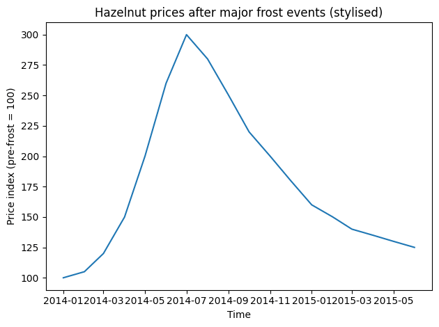 La historia proporciona una guía sobre lo que sucede a continuación. Tras eventos de heladas similares en 2004 y 2014, los precios de las avellanas más que se triplicaron. En el episodio de 2014, los precios comenzaron a subir inmediatamente después de la helada en marzo, alcanzaron su punto máximo a finales de abril hasta principios de mayo de 2015, y luego cayeron aproximadamente un 50% en uno o dos meses a medida que la demanda se ajustaba y se liberaban inventarios.