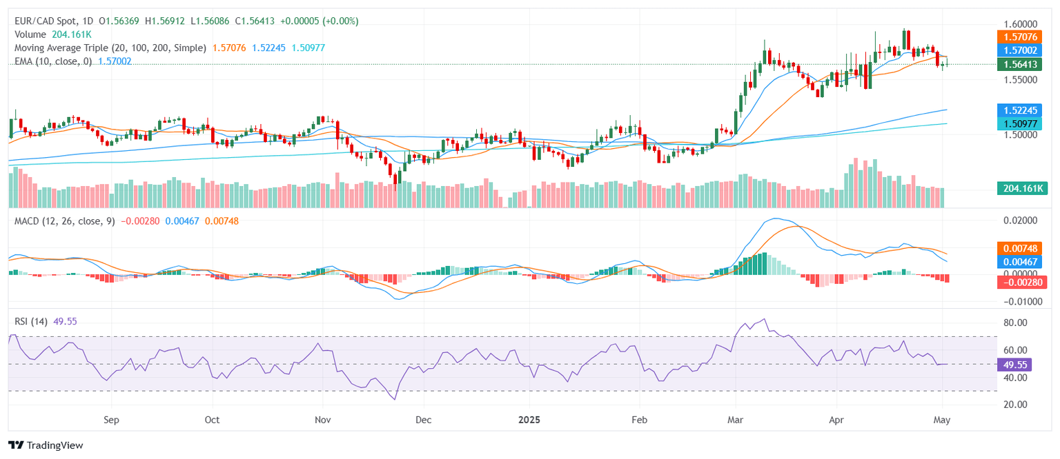El par EUR/CAD se mantuvo cerca de la zona de 1.5600 el viernes después de la sesión europea, mostrando poco cambio en el día pero manteniendo una tendencia alcista constante en general. La acción del precio sigue confinada en la mitad del rango diario, reflejando una consolidación continua. Mientras que las señales a corto plazo muestran vacilación, el panorama más amplio está respaldado por fuertes indicadores basados en tendencias posicionados por debajo de los niveles actuales.