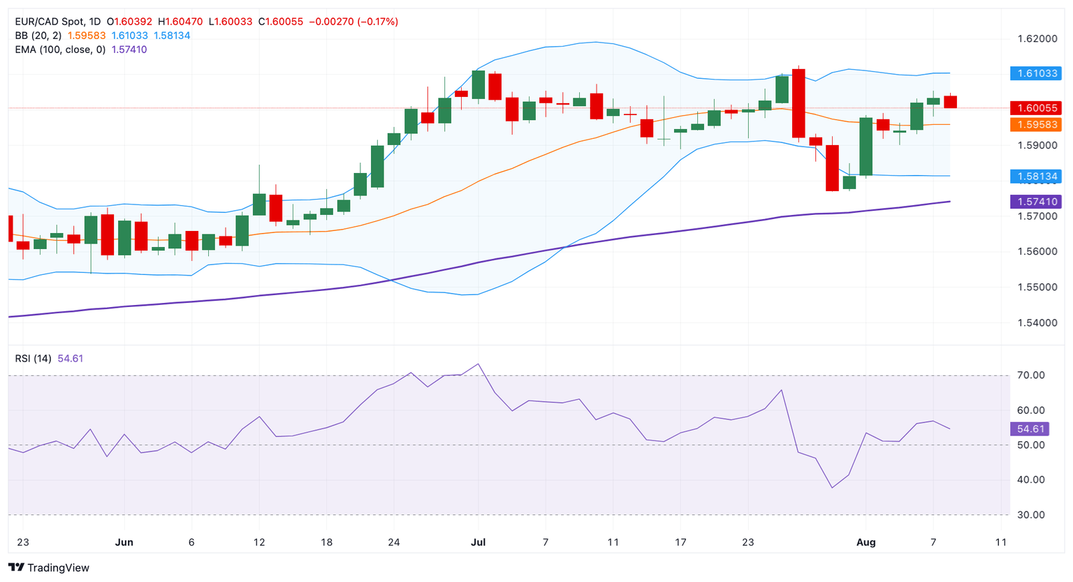 El cruce EUR/CAD atrae a algunos vendedores alrededor de 1.6000 durante las primeras horas de negociación europea del viernes. Todas las miradas estarán puestas en el informe de empleo canadiense de julio, que se publicará más tarde el viernes. Se espera que Canadá muestre un crecimiento moderado del empleo y una tasa de desempleo más alta en julio. Si el informe muestra un resultado más débil de lo esperado, esto podría pesar sobre el Dólar canadiense (CAD) y crear un viento de cola para el cruce.