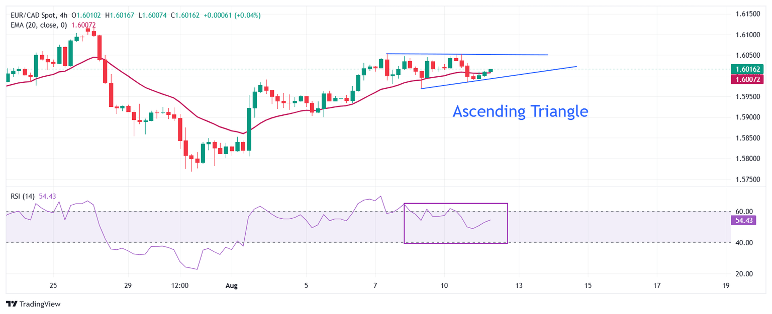 EUR/CAD cotiza en una formación de Triángulo Ascendente en un marco temporal de cuatro horas después de un fuerte repunte en las últimas dos semanas. La frontera horizontal del patrón de gráfico mencionado anteriormente está situada desde el máximo del 7 de agosto alrededor de 1.6055, mientras que la frontera ascendente se traza desde el mínimo del 8 de agosto de 1.5970.