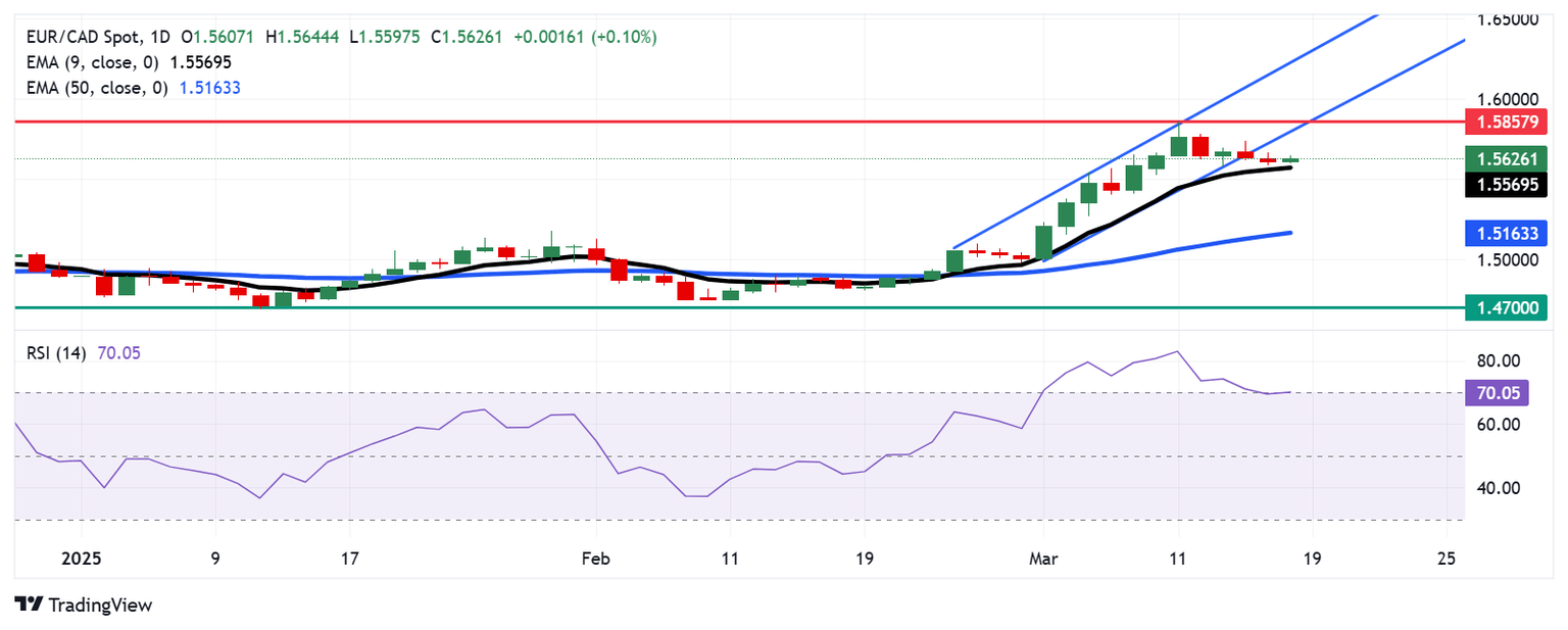 Al alza, el cruce EUR/CAD podría enfrentar resistencia mientras intenta reingresar al canal ascendente cerca del límite inferior alrededor del nivel 1.5780. Más allá de esto, la marca de 1.5857—su nivel más alto desde julio de 2020, alcanzado el 11 de marzo—sirve como el siguiente obstáculo clave. Un regreso exitoso al canal fortalecería la perspectiva alcista, potencialmente llevando el cruce de divisas hacia el límite superior del canal, alrededor de 1.6250.
