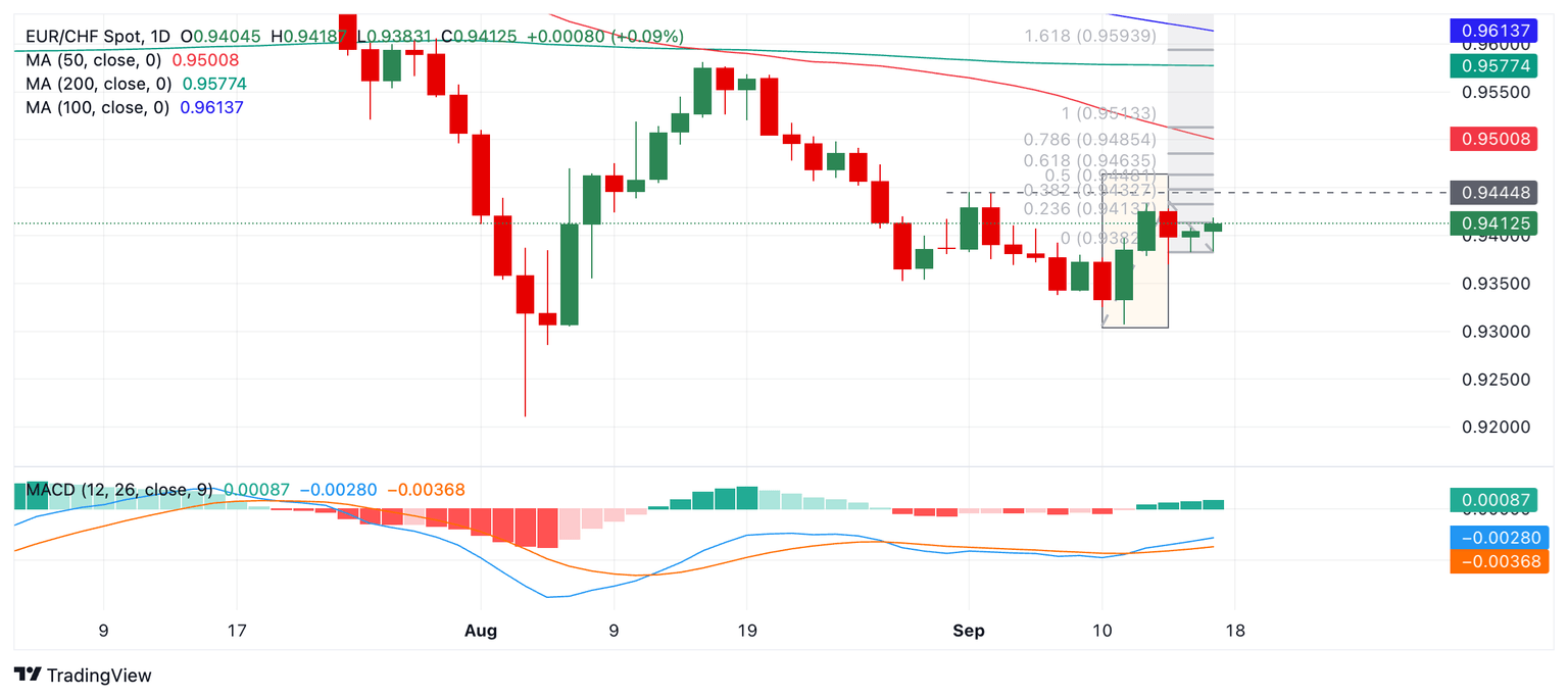 El EUR/CHF alcanzó un fondo temporal el 11 de septiembre y se recuperó. Actualmente cotiza por encima de 0.9400. Hay señales que sugieren que podría continuar al alza a pesar de la tendencia bajista a mediano plazo.