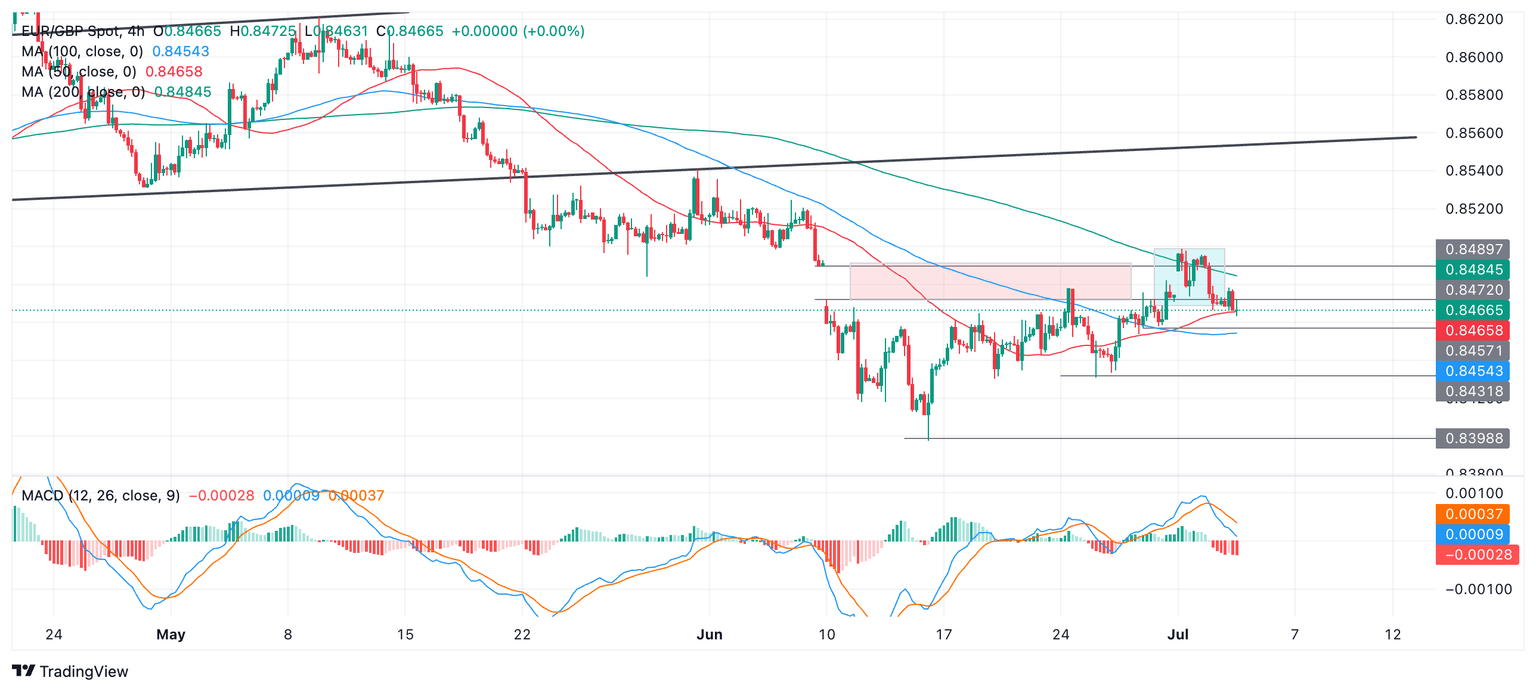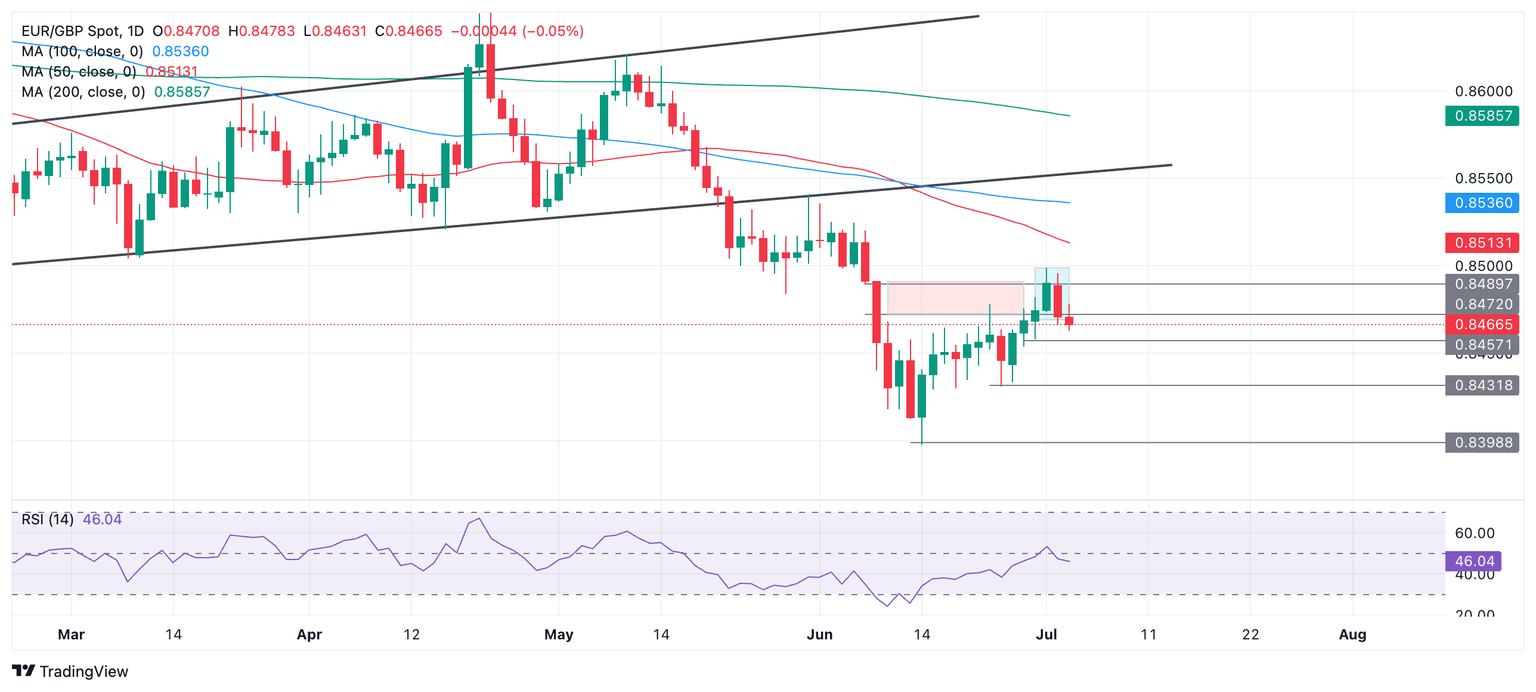 Una ruptura por debajo de 0.8457 (mínimo del 28 de junio) añadiría confirmación.
