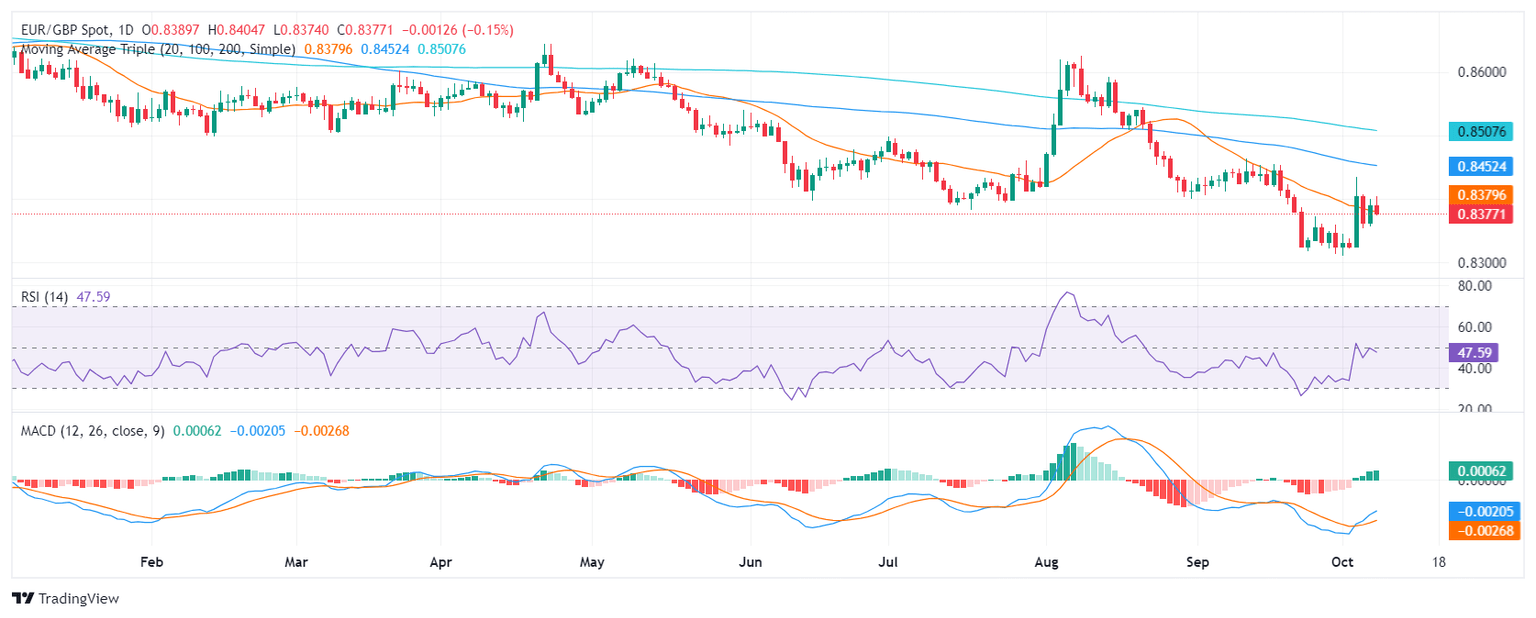 El par EUR/GBP permanece confinado dentro de un rango reciente y cayó un 0,10% el martes hasta 0.8380. Sin embargo, el sesgo en el marco de tiempo más amplio sigue siendo alcista, como sugieren los indicadores técnicos y el par continúa cotizando de lado después del repunte de la semana pasada.