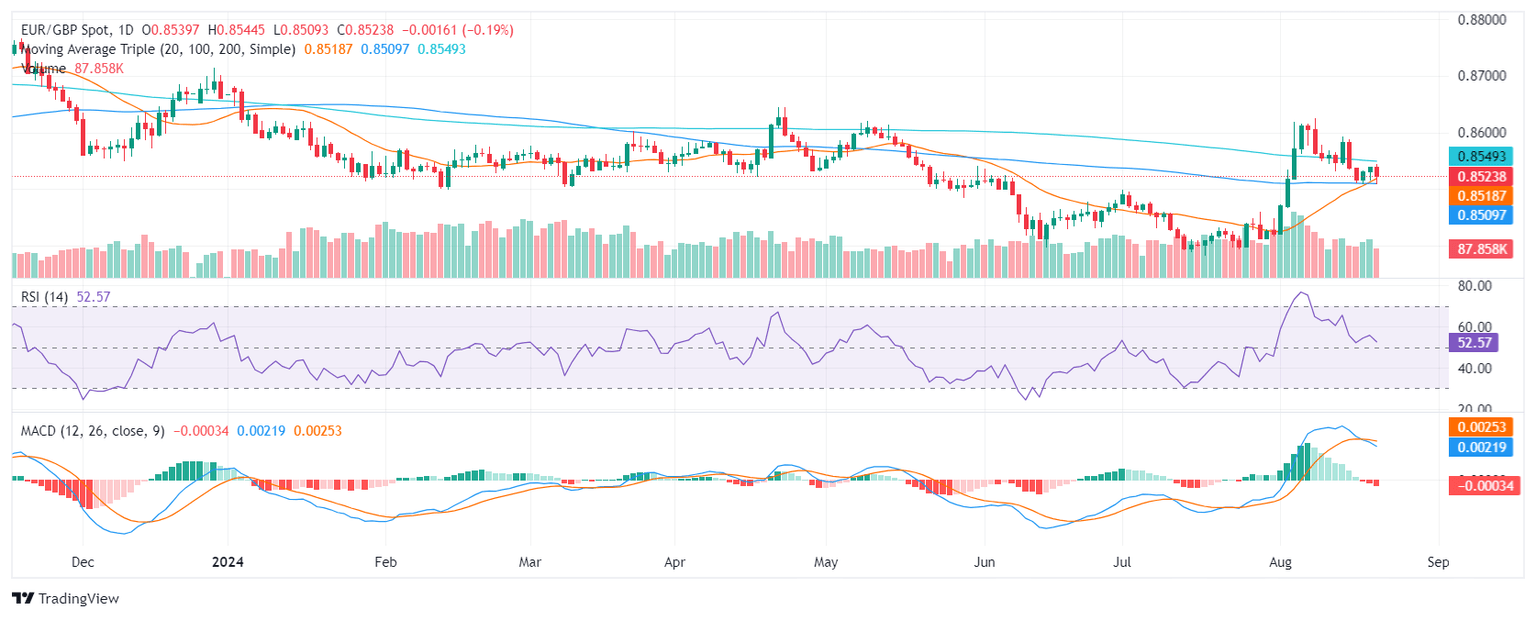 El jueves, el par EUR/GBP continuó su tendencia a la baja, perdiendo un 0.30% para finalizar en 0.8490. Los indicadores técnicos presentan una perspectiva mixta, con las fuerzas de venta pareciendo tomar el control.