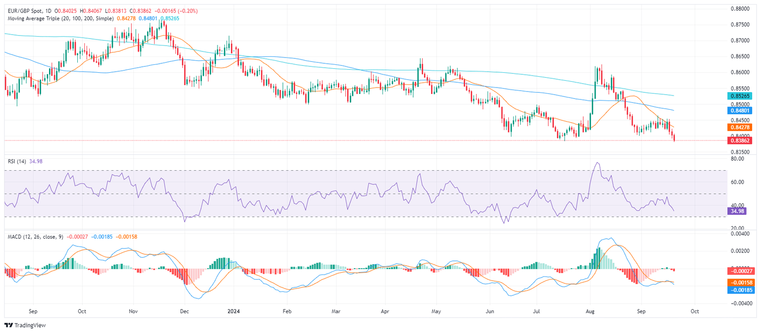 En la sesión del viernes, el par EUR/GBP continuó su declive, perdiendo un 0.15% para cerrar en 0.8385. La perspectiva bajista persiste, ya que la presión de venta se intensifica y los indicadores técnicos señalan una tendencia negativa.
