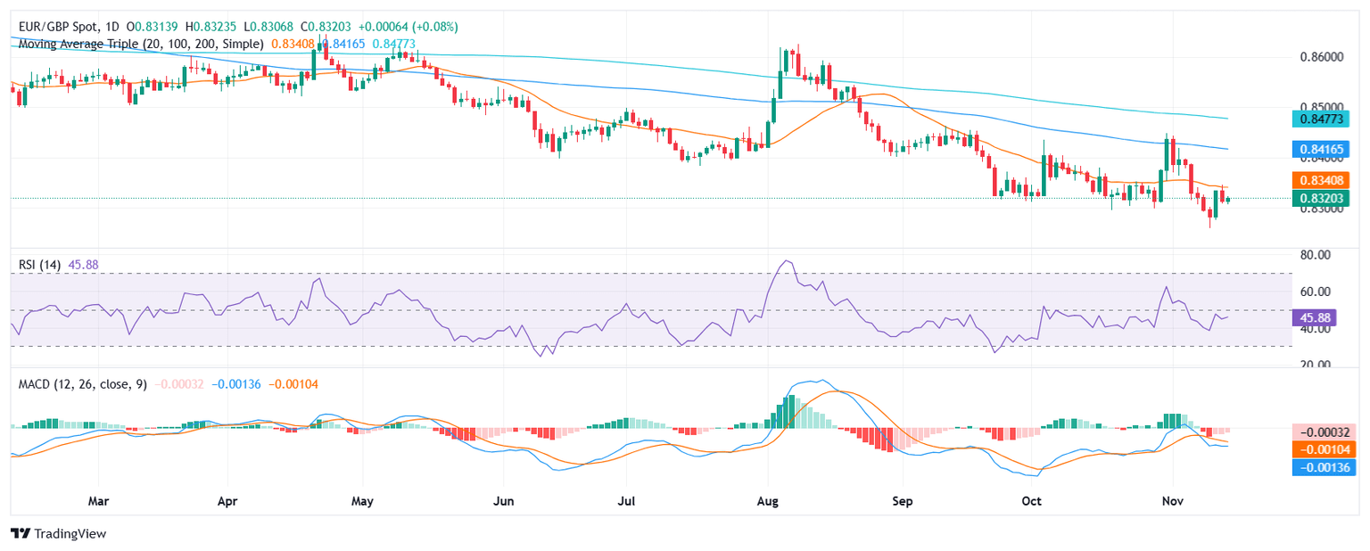El par EUR/GBP subió a 0.8320 en la sesión del jueves. A pesar de una pausa temporal para los bajistas después de las recientes caídas, los indicadores técnicos siguen siendo profundamente negativos, con el par cotizando por debajo de la media móvil simple (SMA) de 20 días que se sitúa en torno a 0.8340. Esto sugiere que la perspectiva a corto plazo sigue siendo bajista hasta que se conquiste este nivel.