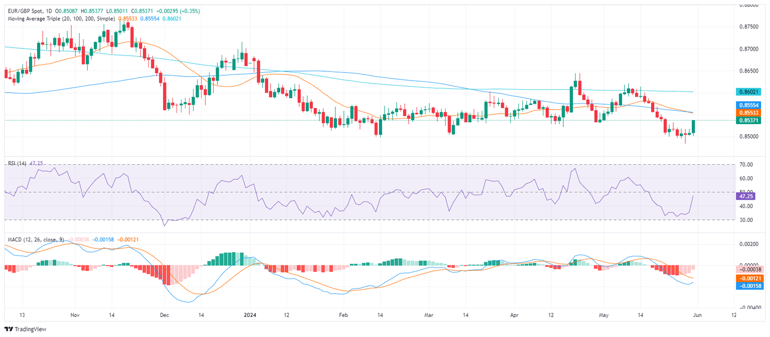 - EUR/GBP subió bruscamente el viernes a 0.8531, registrando una ganancia del 0.26%.