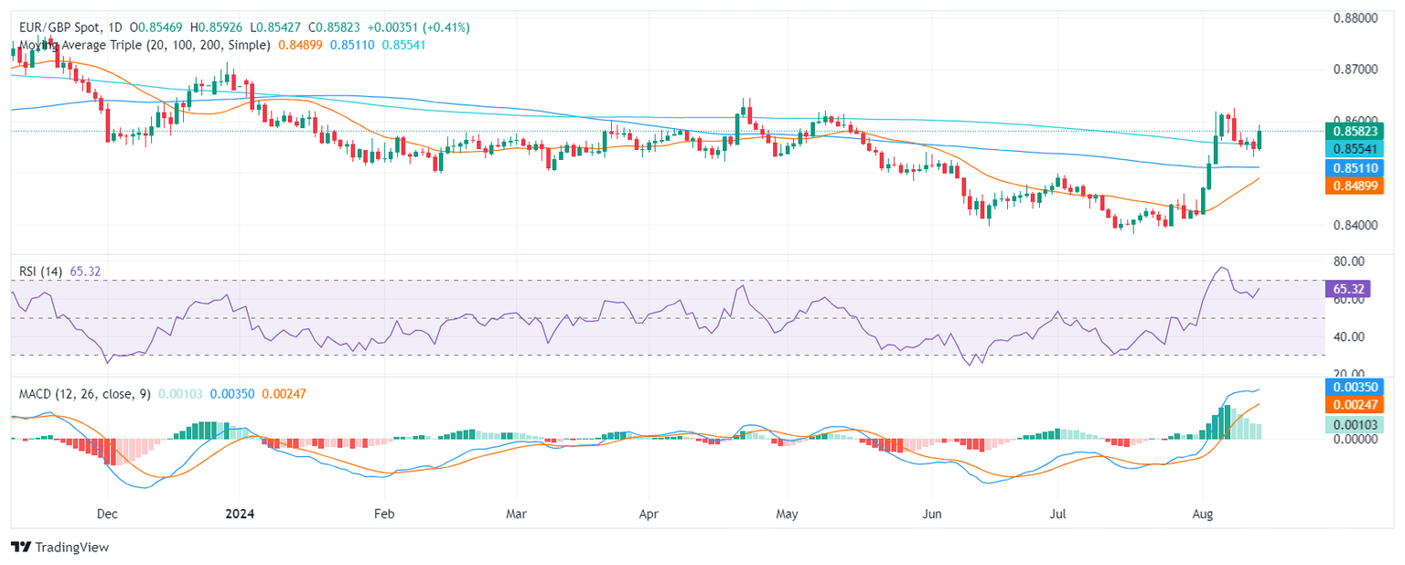 El EUR/GBP ha mostrado una tendencia general alcista en las sesiones recientes. El RSI del par EUR/GBP fluctúa alrededor de valores medios, indicando que los toros están ganando fuerza y tienen más camino por recorrer. El RSI más alto fue alrededor de 62, lo que sugiere una ligera presencia de sobrecompra. El MACD muestra barras verdes constantes, confirmando la presencia de compradores.