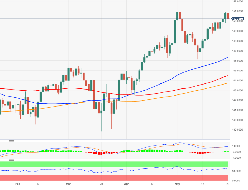 La continuación de las subidas parece un escenario plausible a corto plazo, y una ruptura convincente del nivel redondo clave de 150.00 podría animar al cruce a disputar el máximo de 2023 en 151.61 (2 de mayo) en un futuro no muy lejano.