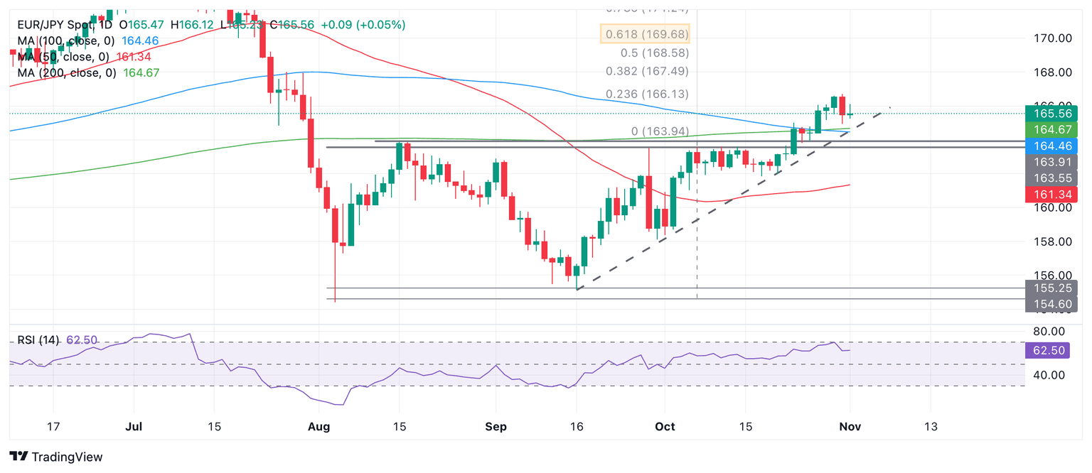Las tendencias a corto y medio plazo son alcistas, lo que sugiere que las probabilidades favorecen más alzas por venir y una reanudación de la tendencia alcista. Una ruptura por encima de 166.69 (máximo del 31 de octubre) probablemente confirmaría una continuación al alza.