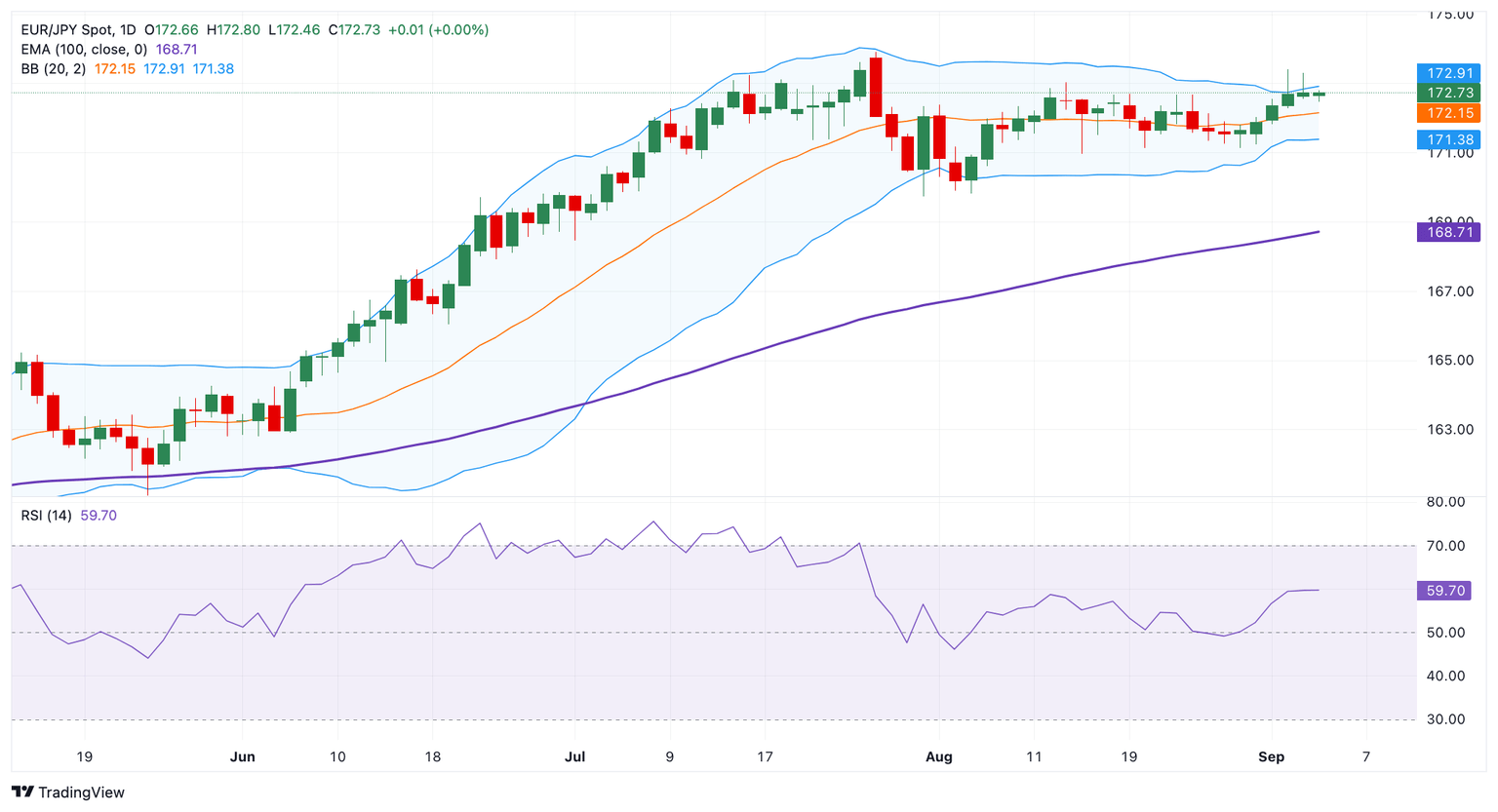 El cruce EUR/JPY opera en un tono plano cerca de 172.65 durante la sesión europea temprana del jueves. Los operadores permanecen divididos sobre el probable momento y ritmo de las subidas de tasas del Banco de Japón (BoJ) en medio de incertidumbres relacionadas con tarifas. El informe de ventas minoristas de la Eurozona estará en el centro de atención más tarde el jueves, que se espera que muestre un aumento del 2.4% interanual en julio.