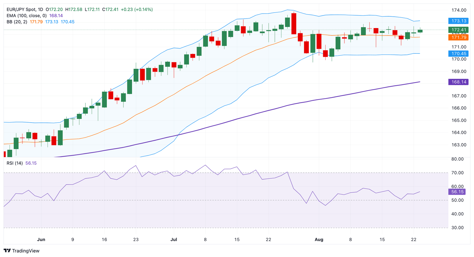 Técnicamente, la perspectiva constructiva del EUR/JPY se mantiene ya que el cruce está bien respaldado por encima de la media móvil exponencial (EMA) clave de 100 días en el gráfico diario. El impulso alcista se refuerza por el Índice de Fuerza Relativa (RSI), que se sitúa por encima de la línea media cerca de 55.75, sugiriendo que un mayor alza parece favorable.