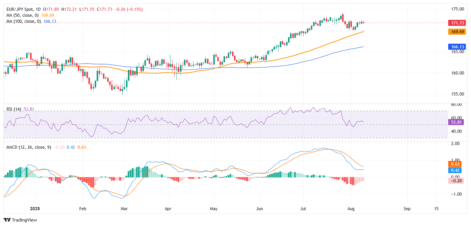 - El EUR/JPY cotiza estable cerca de 172.00 el lunes, ya que el enfoque geopolítico se desplaza hacia la reunión entre Trump y Putin el 15 de agosto en Alaska.
