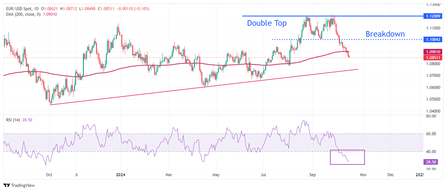 El EUR/USD se desliza más cerca de 1.0800 en las primeras horas de negociación en Norteamérica. El principal par de divisas extiende su caída después de romper por debajo de la media móvil exponencial (EMA) de 200 días, que cotiza alrededor de 1.0900, a principios de esta semana.
