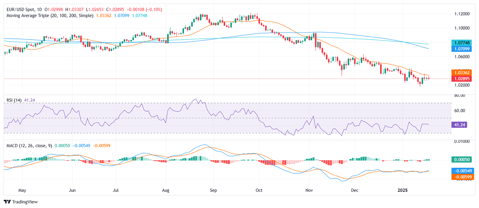 El par EUR/USD tuvo dificultades para mantener el impulso alcista el viernes, cayendo un 0.20% para situarse alrededor del nivel de 1.0285. Los esfuerzos por romper decisivamente por encima de la media móvil simple (SMA) de 20 días una vez más se quedaron cortos, subrayando los vientos en contra persistentes que enfrenta cualquier recuperación a corto plazo. Aunque el par ha logrado evitar una venta masiva más pronunciada, el apetito del mercado por ganancias más fuertes parece atenuado. En el frente técnico, el Índice de Fuerza Relativa (RSI) ha subido ligeramente a 44, un nivel que aún sugiere matices bajistas persistentes. Mientras tanto, el histograma del indicador de convergencia/divergencia de medias móviles (MACD) continúa imprimiendo barras verdes planas, lo que indica que los compradores aún no han intervenido completamente para revertir el reciente rechazo del par desde la resistencia superior.