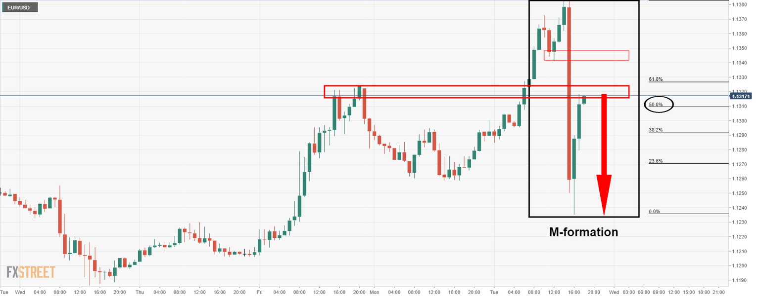 Como puede verse, el precio ha corregido más del 50% de la caída en la sesión americana y se esperaría que comience a desacelerarse en esta coyuntura. Dicho esto, hay espacio para probar los mínimos de la línea de cuello de la formación M cerca de 1.1340. Sin embargo, el sesgo es a la baja por debajo de dicho nivel para las próximas sesiones a mediados de semana, aunque la brusquedad de la corrección probablemente signifique que los bajistas no están completamente comprometidos, lo que probablemente deje al precio de lado entre los mínimos recientes cerca de 1.1230 y máximos cerca de 1.1385.
