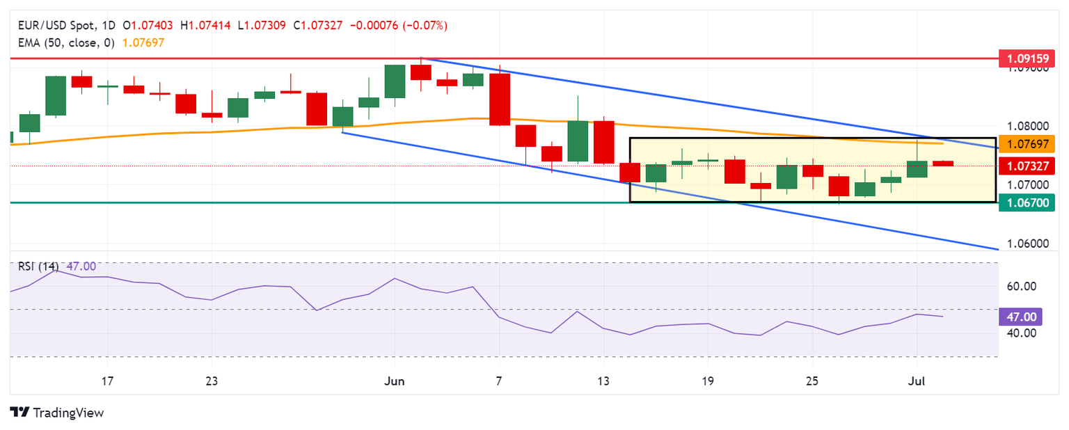 El EUR/USD detiene su racha de tres días de ganancias, cotizando alrededor de 1.0730 durante las horas asiáticas del martes. Un análisis técnico del gráfico diario indica un sesgo bajista, con el par consolidándose dentro de un canal descendente.