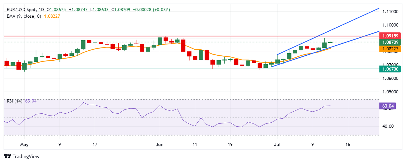 A la baja, el soporte inicial para el EUR/USD se encuentra cerca del límite inferior del canal ascendente alrededor del nivel de 1.0830, seguido por la media móvil exponencial (EMA) de nueve días en el nivel de 1.0822.